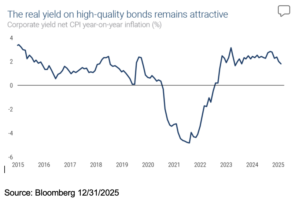 We see 2026 shaping up to be a year where investors should be able to find value by extending duration and focusing on high quality global diversification. With 10-year Treasury yields around 4% and investment-grade credit yielding near 5%, investors can generate solid real income, especially with inflation hovering around 3%.