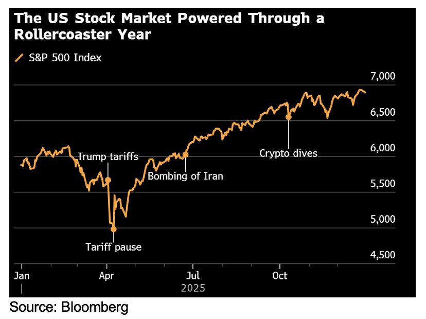 Closing out 2025, global stock markets delivered a spectacular performance. Despite initial volatility surrounding President Trump’s “Liberation Day” tariffs, the U.S. market rose like a phoenix, powered by robust corporate earnings. The S&P 500 gained 17.9% in 2025, marking its third consecutive year of double-digit gains1.
